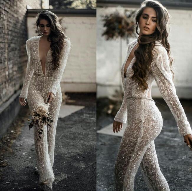 Jumpsuits Wedding Dresses Lace Appliqued Bridal Gowns Deep V Neck Beaded Crystal Boho Robes De Mariée