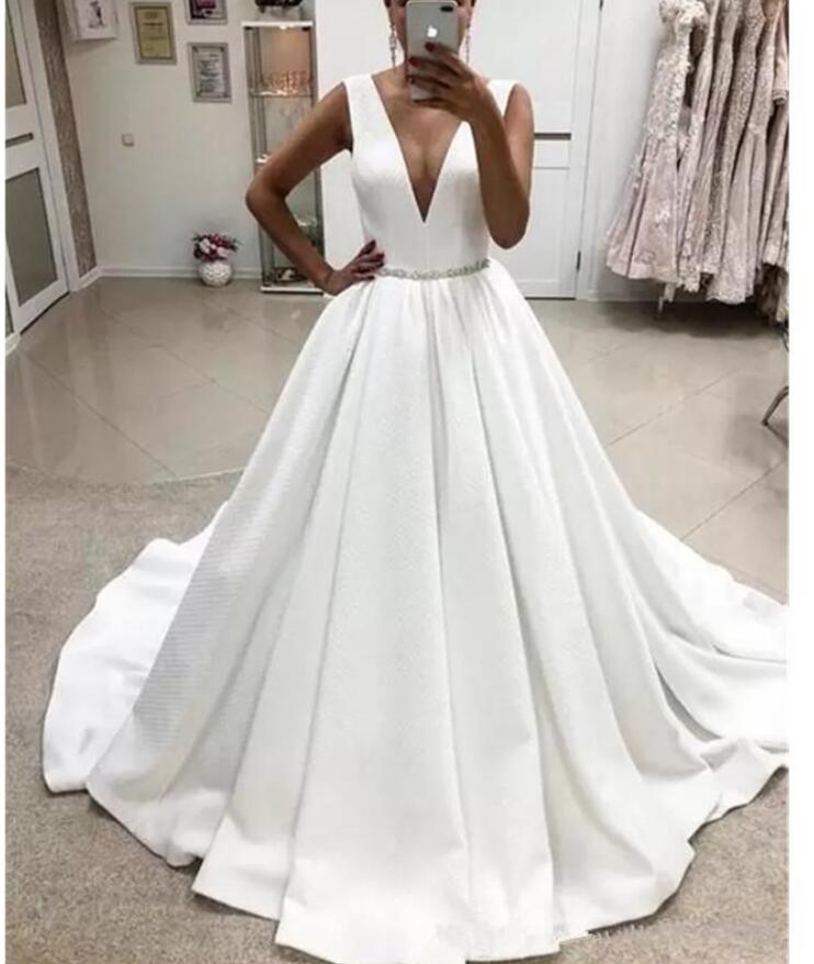 Princess New White Bridal Gown Strap V Neck Stain Wedding Dresses A Line Simple Style Waist Beaded Crystal Church Custom Made