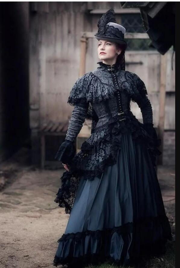 Steampunk Events Gothic Lace Wedding Dress Long Sleeves High Neck A-Line Floor Length Dark Gray And Black Vintage Victorian Women Formal Gowns
