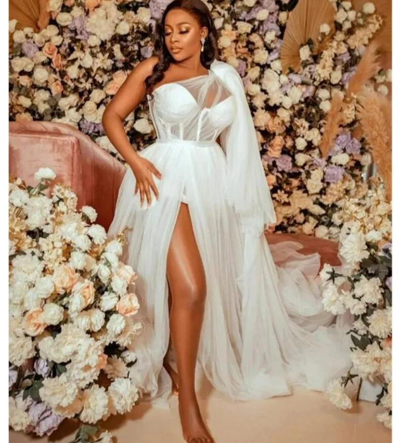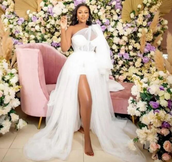 Sexy African White Wedding Dress 2023 Aso Ebi Bride Bridal Gowns One Shoulder Side Split A Line Crystal
