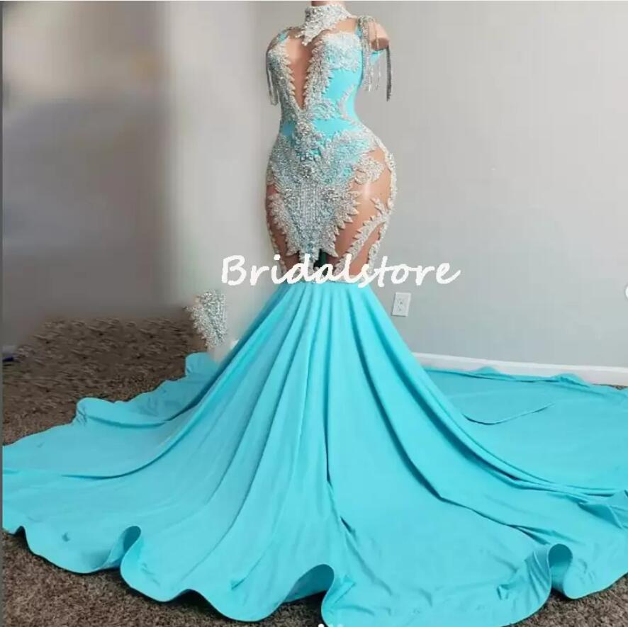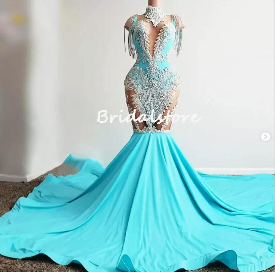 African Mermaid Prom Dresses Blue Appliques Plus Size Black Girls Evening Dress Tassel Long Formal Party Gown Women Vestidos De Noche Femme Robes