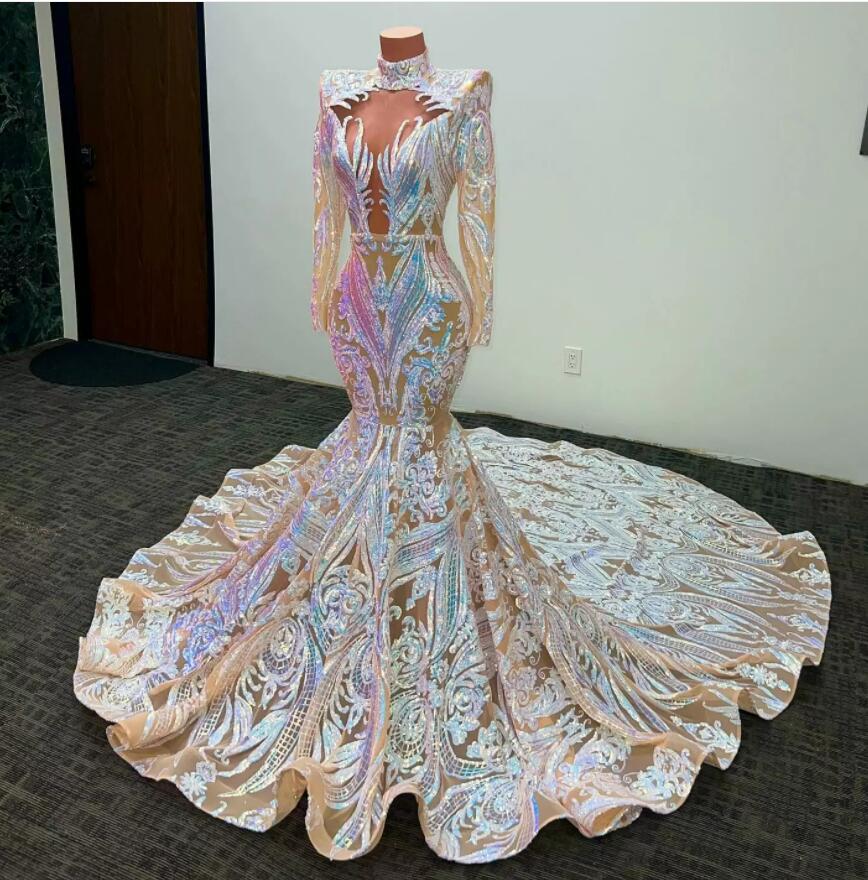 Stunning Backless Mermaid Prom Dresses Beaded Plunging Neck Long Sleeves Lace Evening Gowns Sweep Train Plus Size Sequined Formal Wear