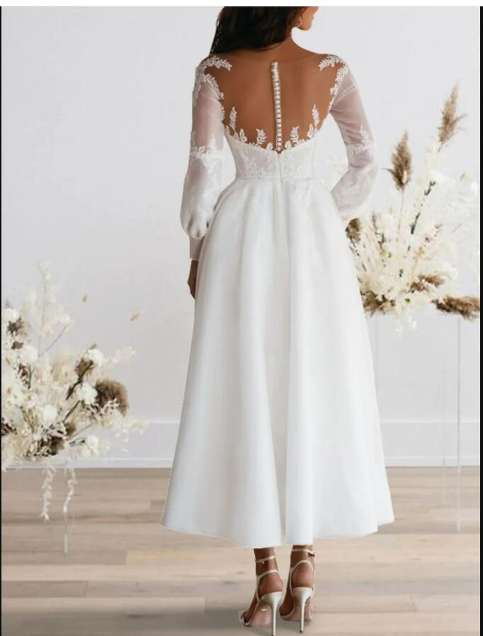 Ankle Length A-Line Long Sleeve Illusion Neck Appliques Lace Bridal Gowns Summer Boho Robe De Mariage