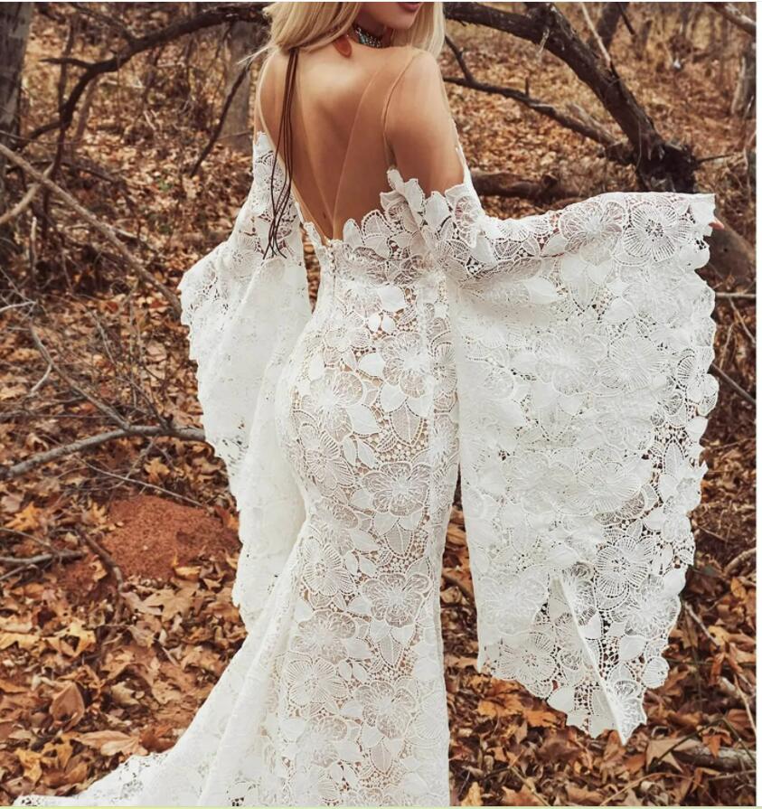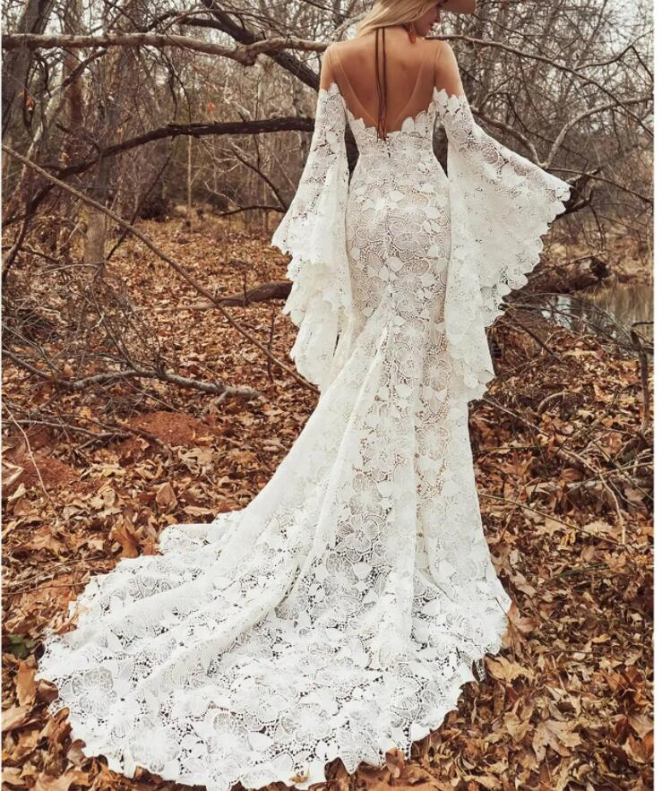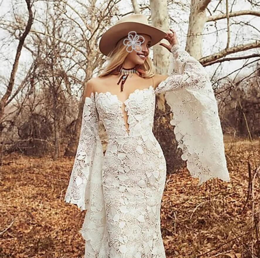 Long Boho Sleeves Bridal Gowns Plus Size Wedding Dresses 2023 Sheer O-neck Vintage Crochet Bold cotton Lace Bohemian Hippie Country Bride Gowns